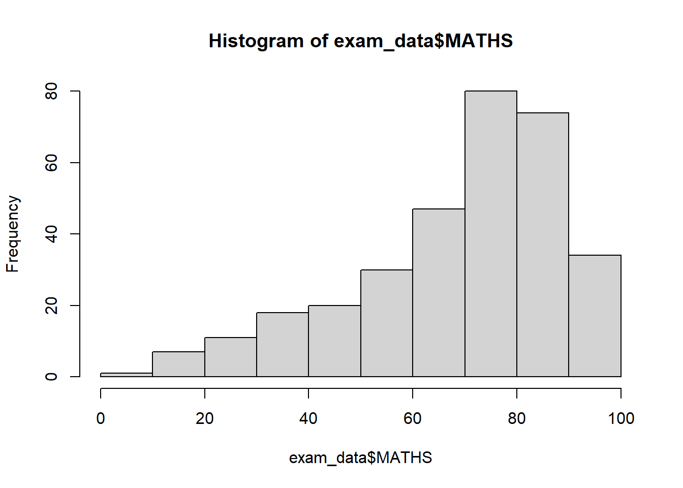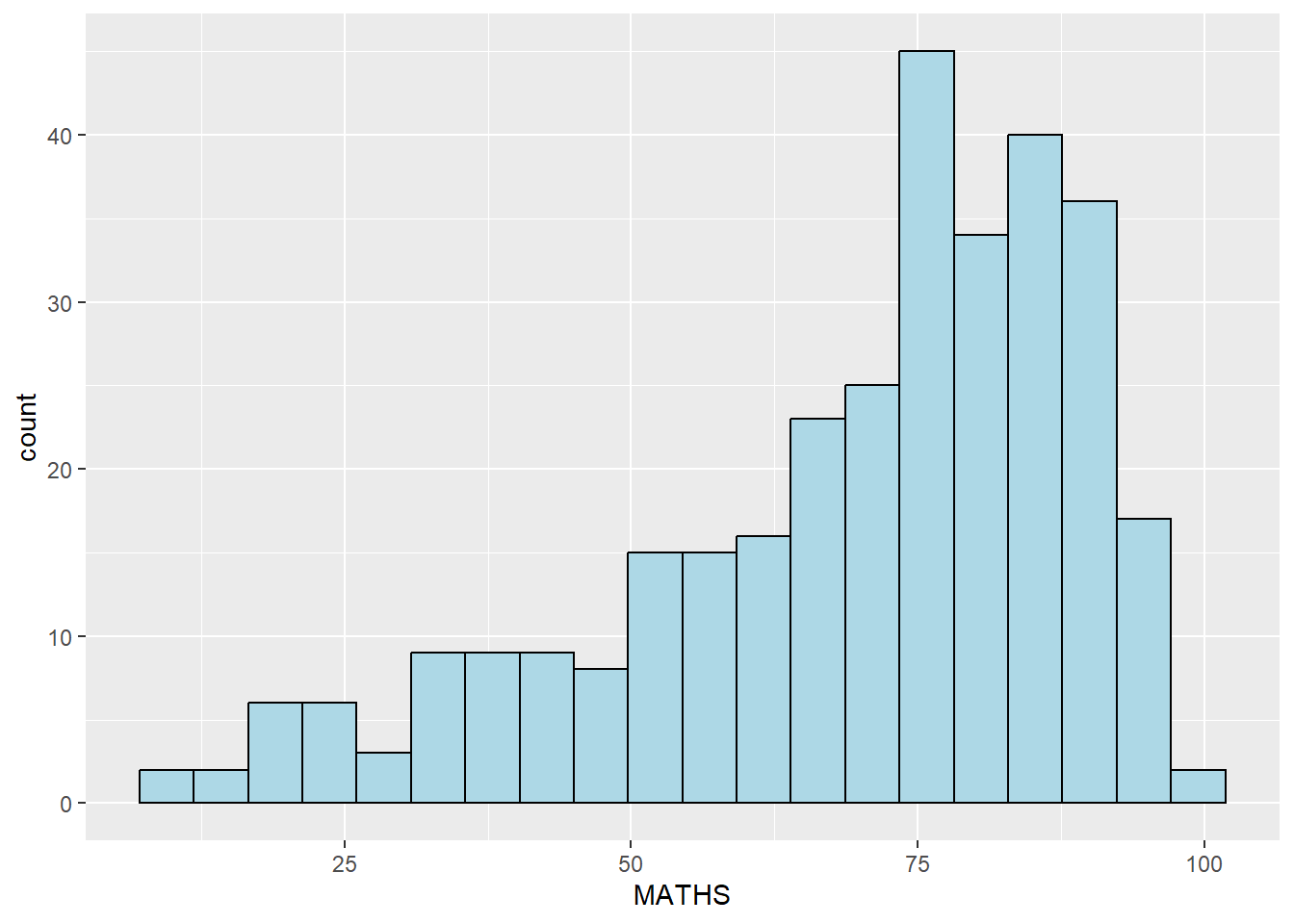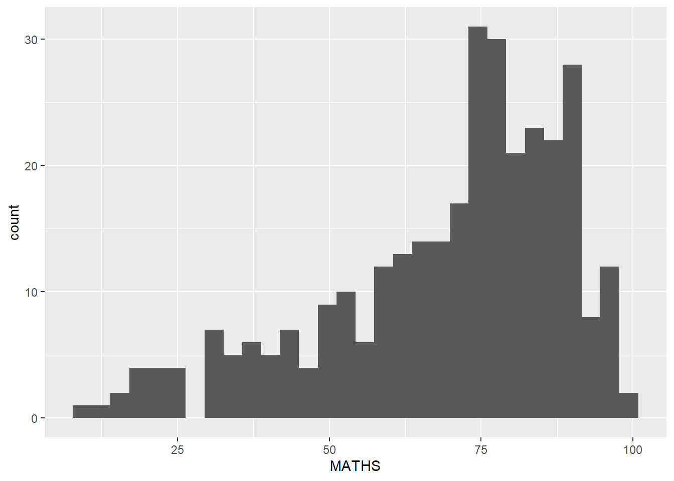 In the code chunk below, geom_histogram() is used to create a simple histogram by using values in MATHS field of exam_data.