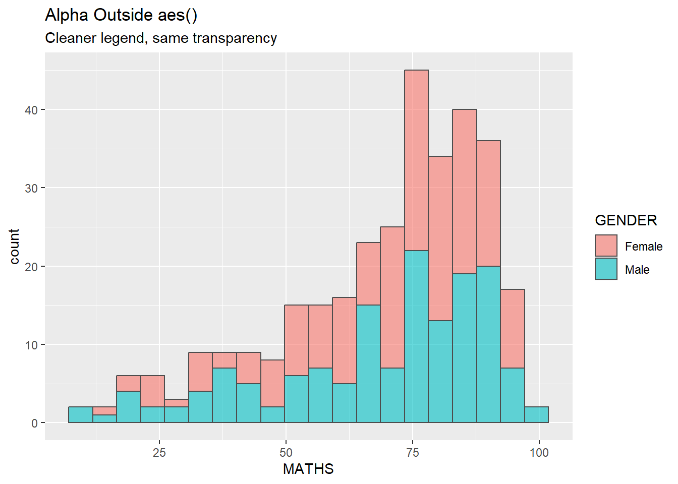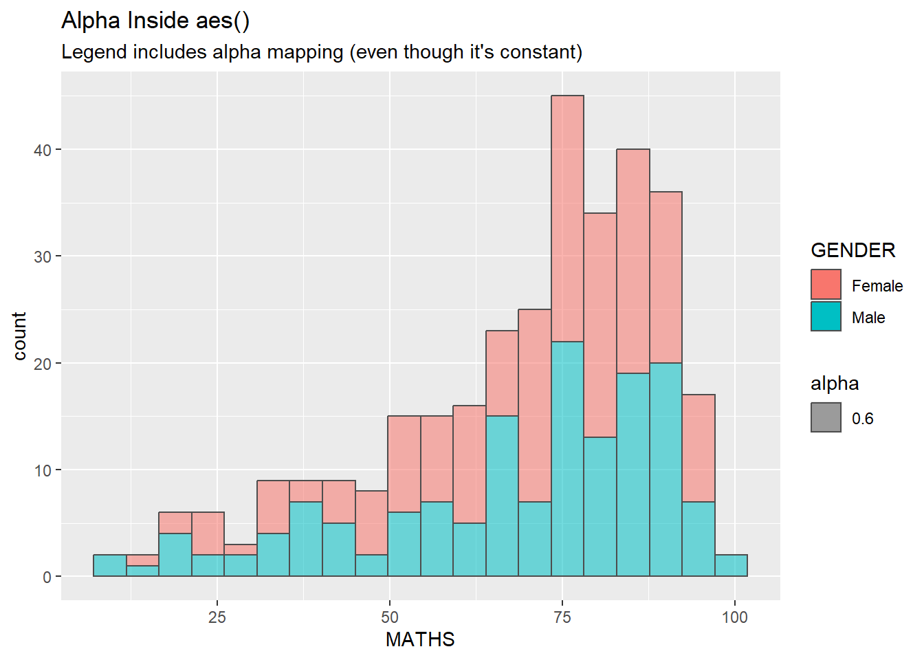 ggplot(exam_data, aes(x = MATHS, fill = GENDER, alpha = 0.6)) +