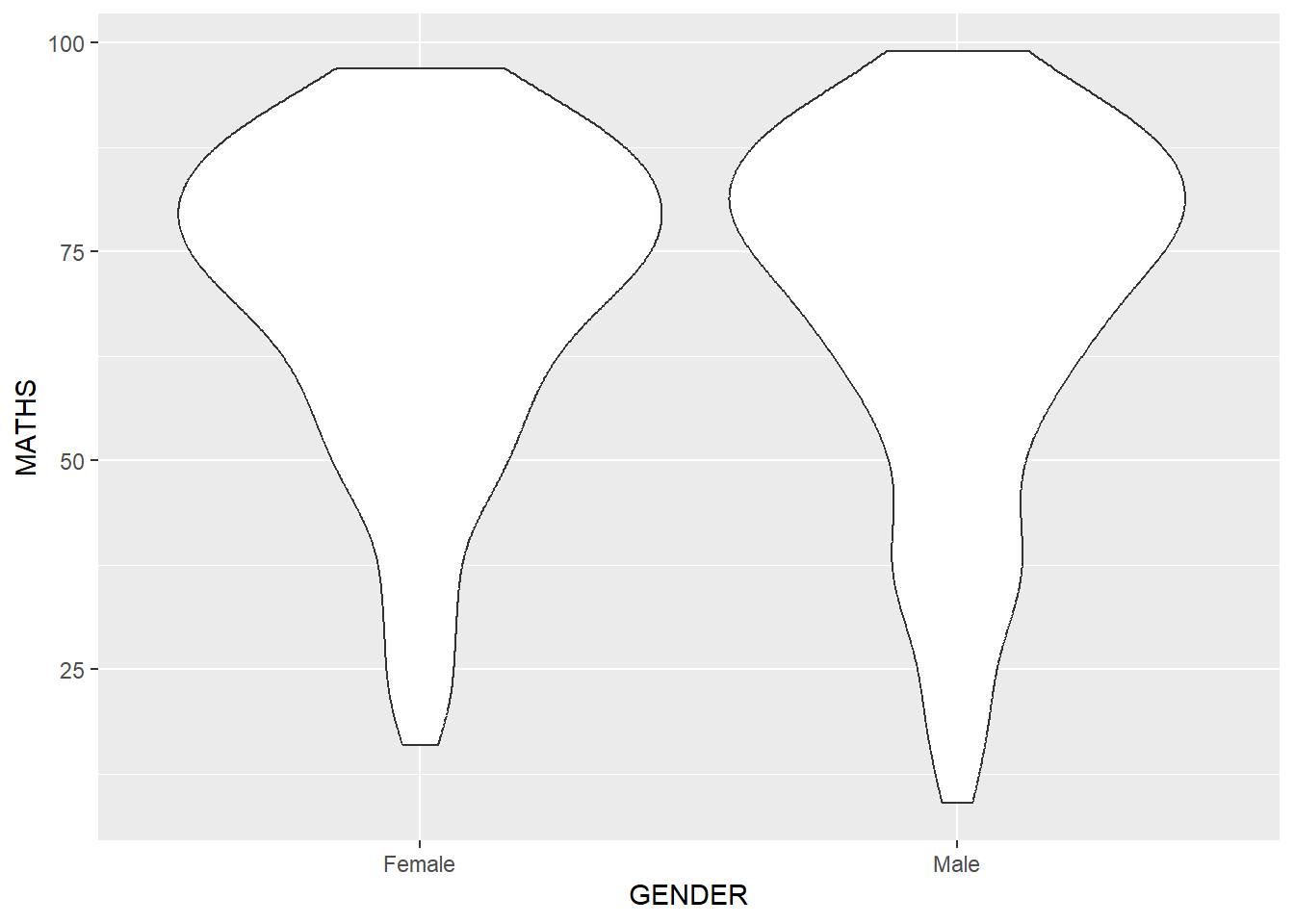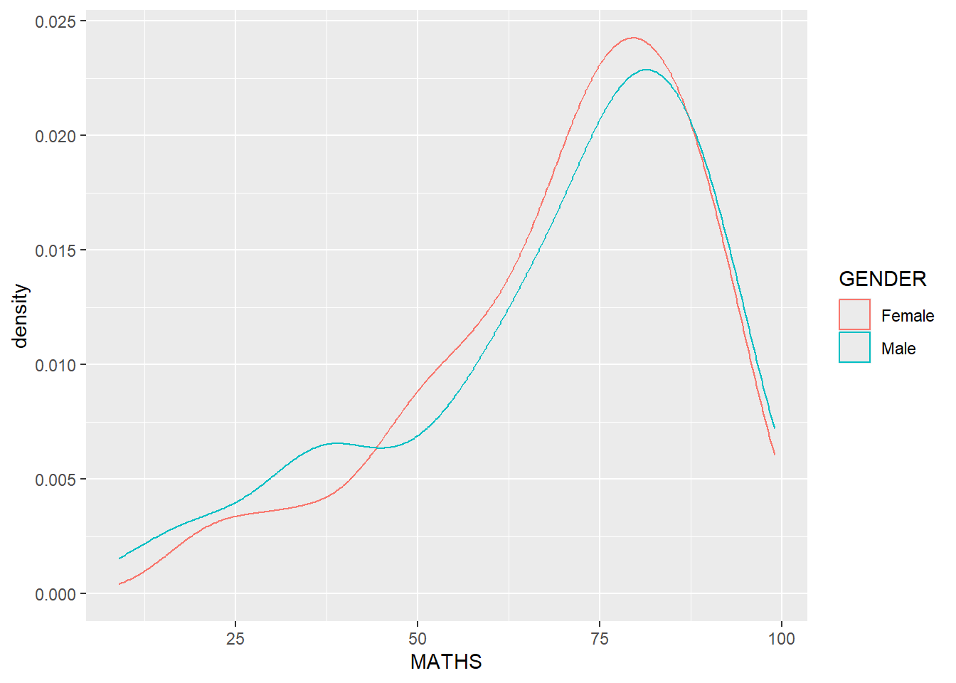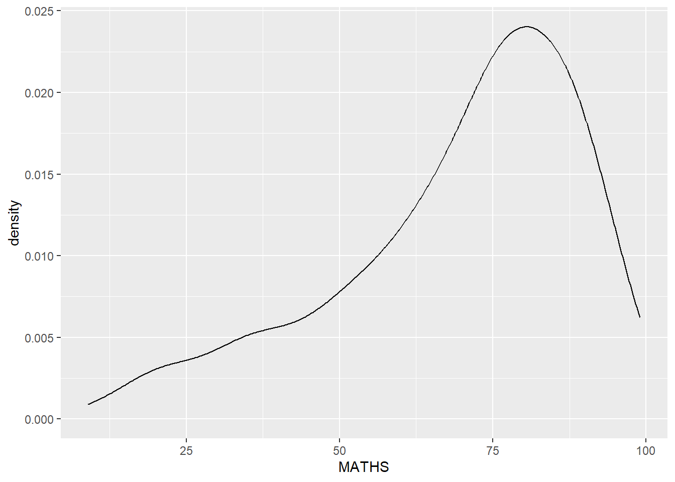 The code below plots the distribution of Maths scores in a kernel density estimate plot.