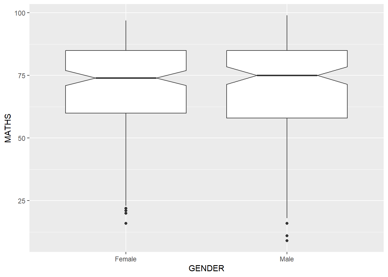 The code chunk below plots the distribution of Maths scores by gender in notched plot instead of boxplot.