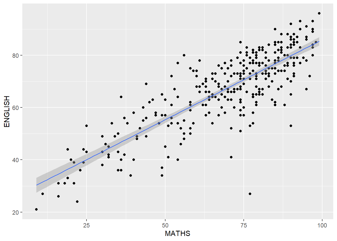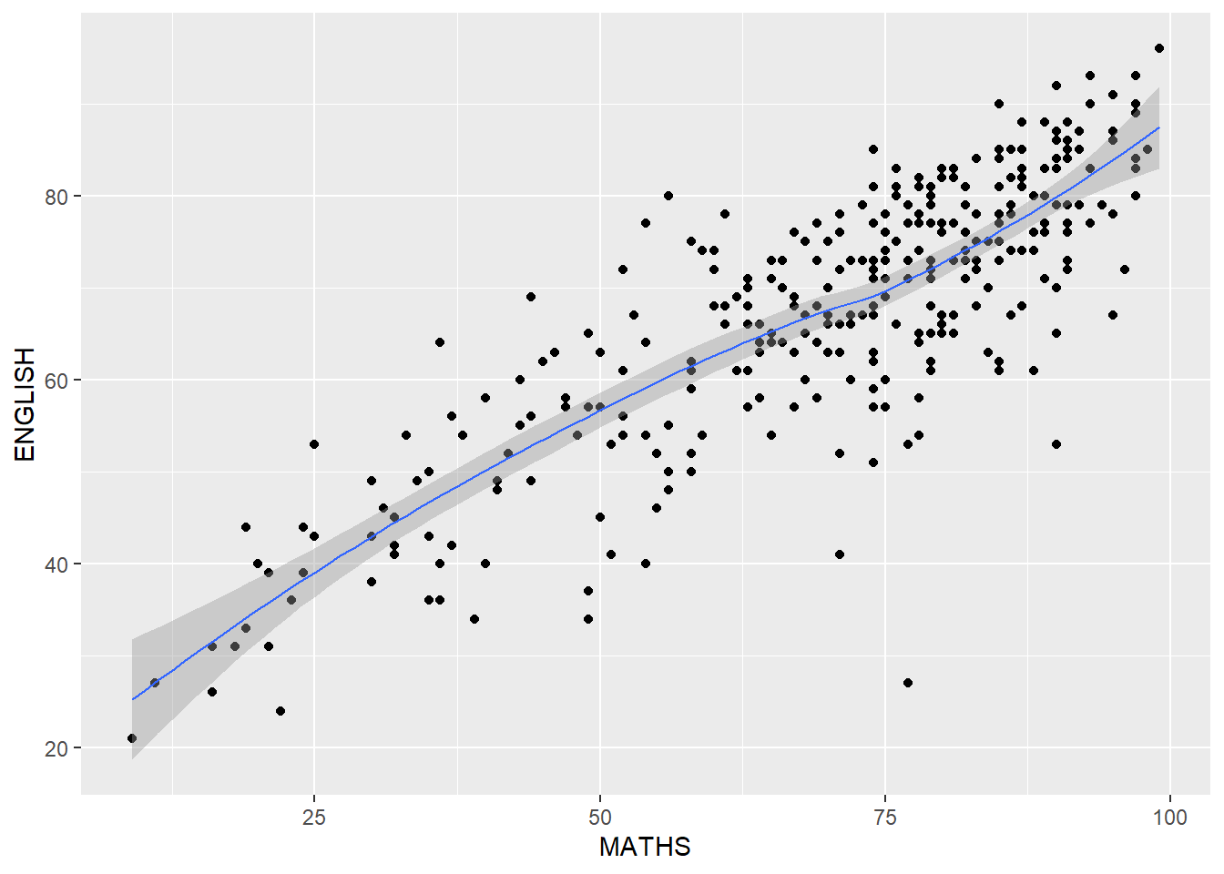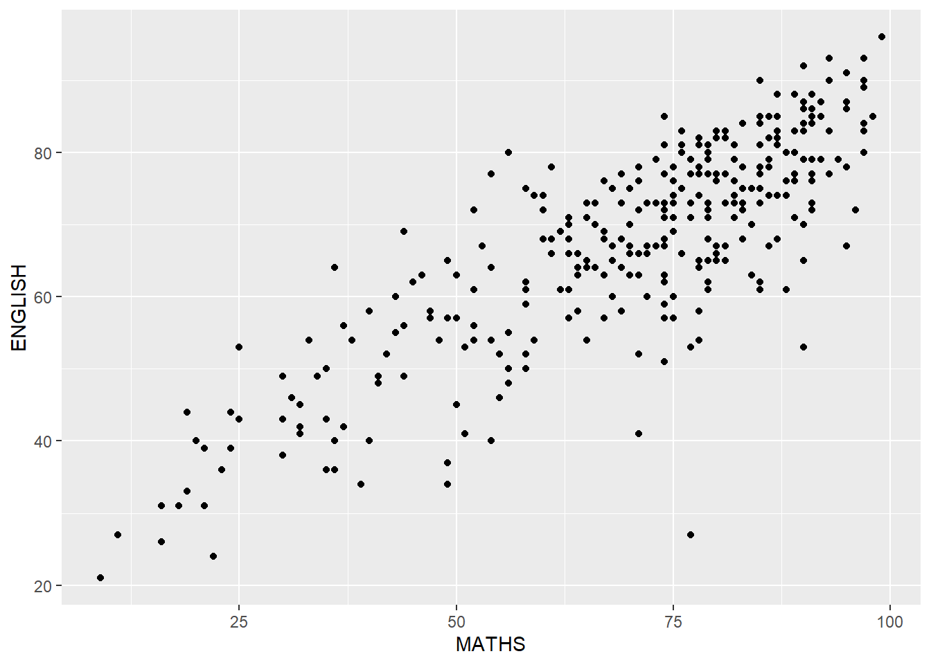 The code chunk below plots a scatterplot showing the Maths and English grades of pupils by using geom_point().