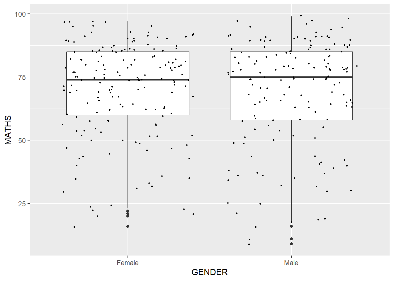 The code chunk below plots the data points on the boxplots by using both geom_boxplot() and geom_point().
