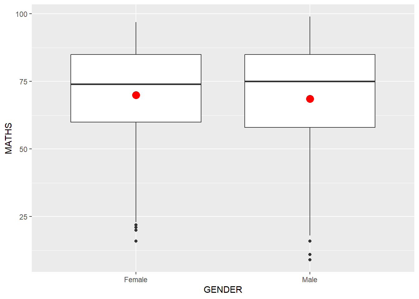 The code chunk below adds mean values by using stat_summary() function and overriding the default geom.