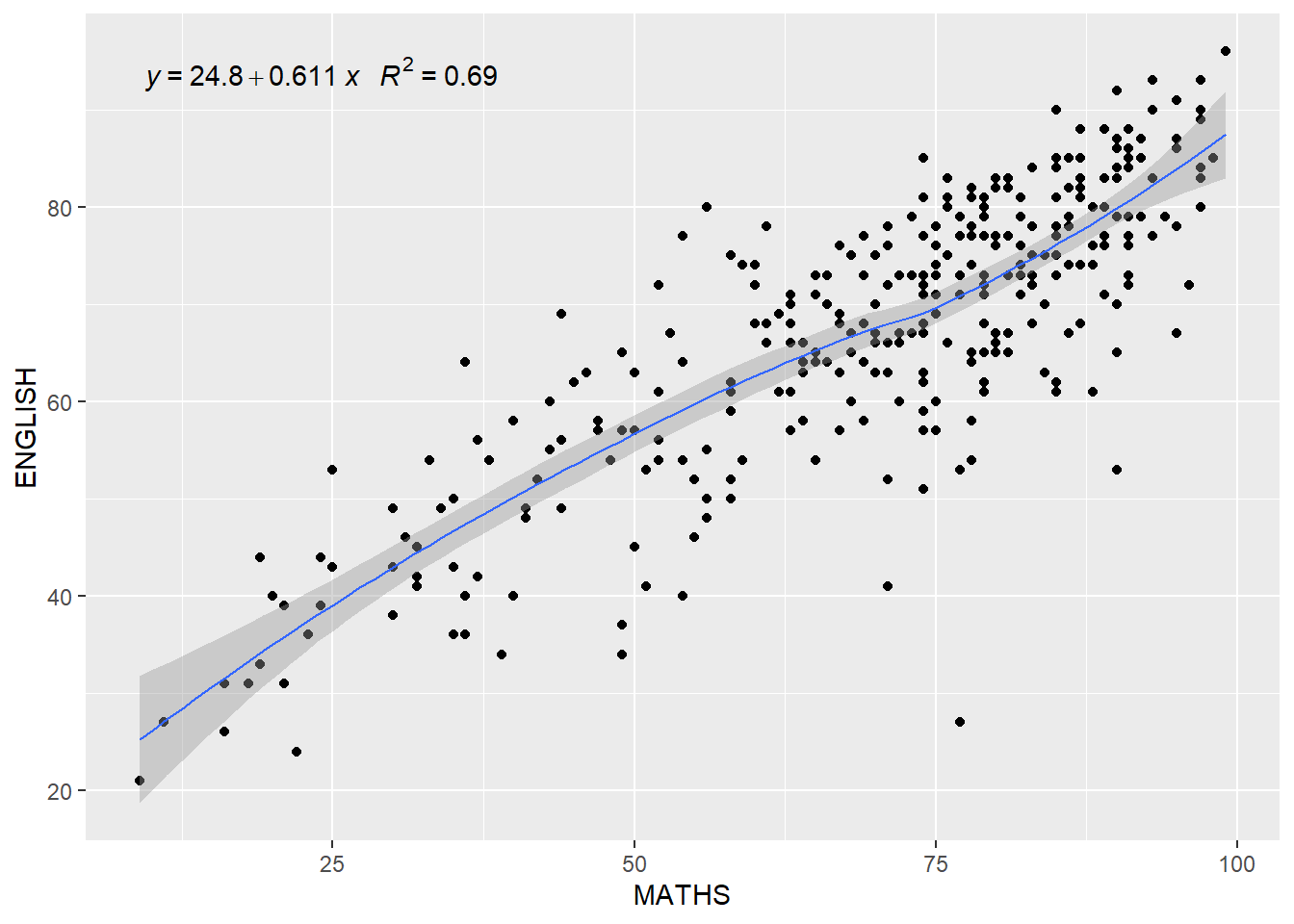 The scatterplot below shows the relationship of Maths and English grades of pupils. The interpretability of this graph can be improved by adding a best fit curve.