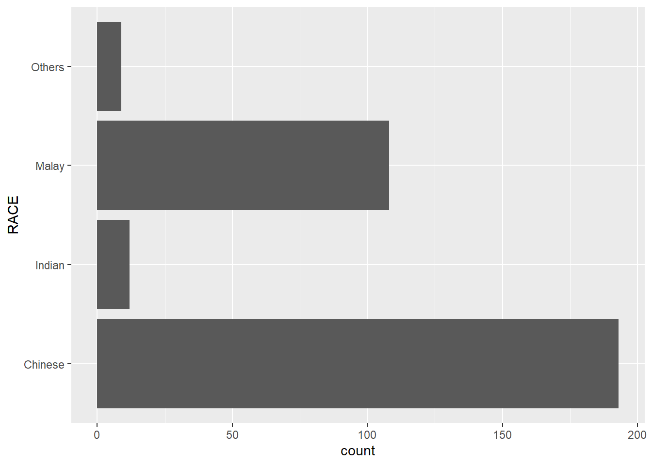 The code chunk below flips the horizontal bar chart into vertical bar chart by using coord_flip().