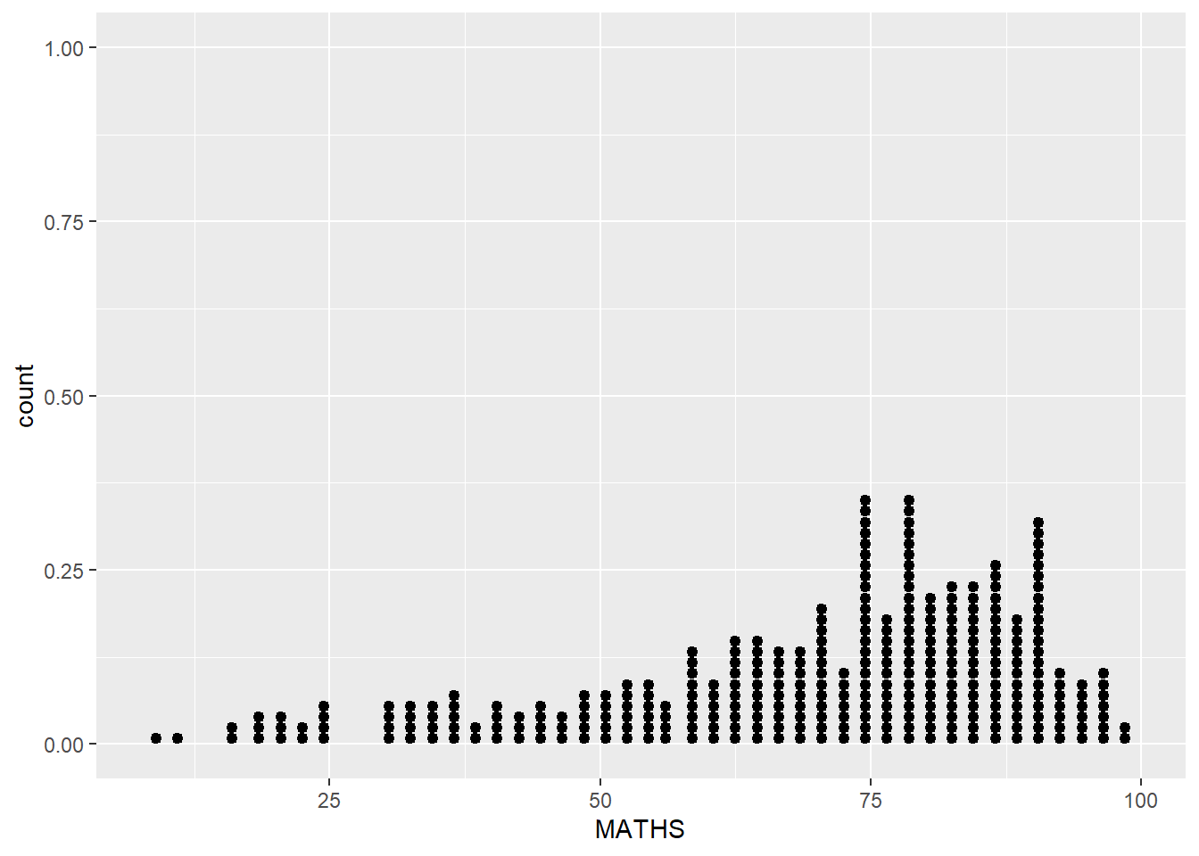 In the code chunk below, geom_dotplot() of ggplot2 is used to plot a dot plot.