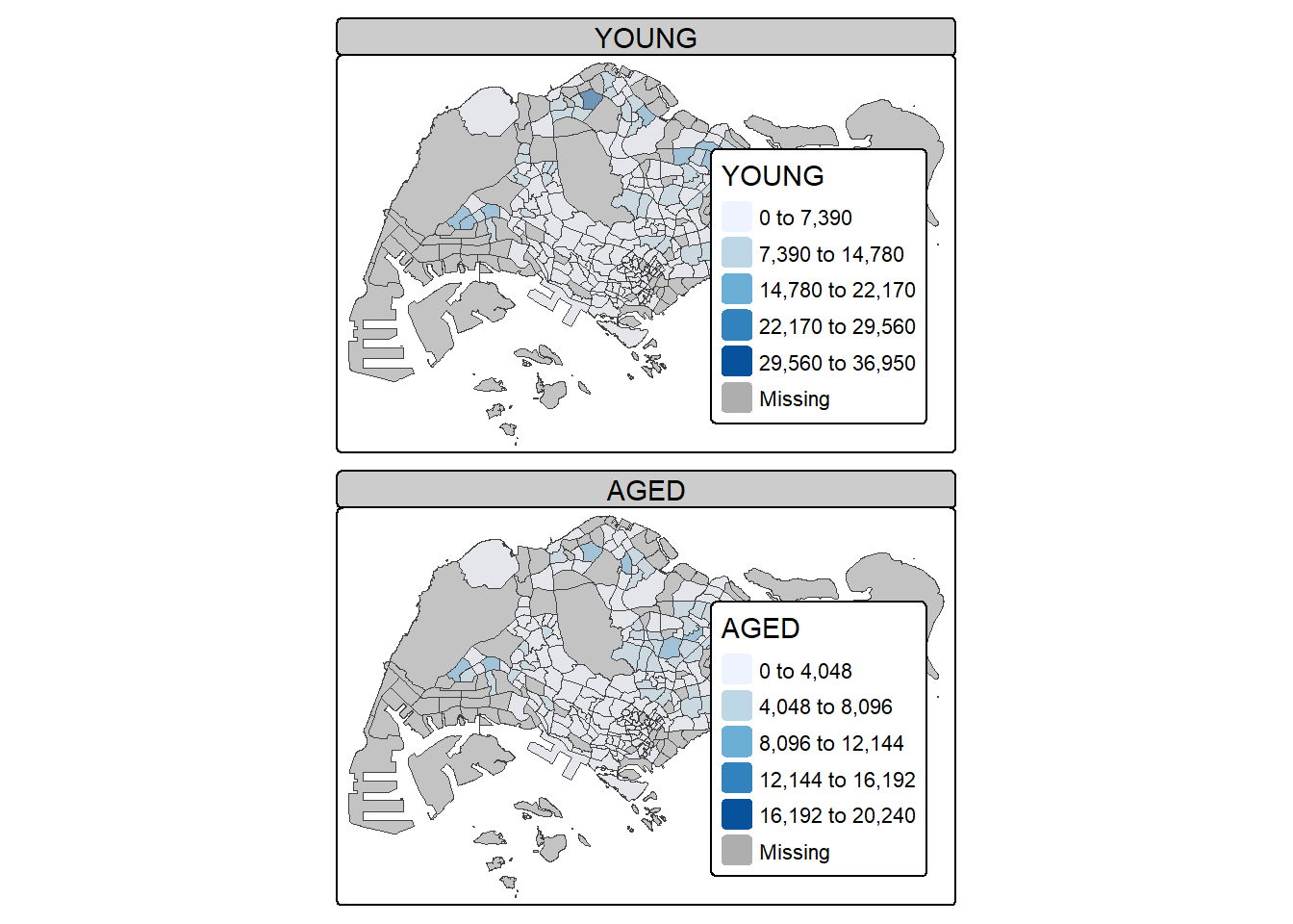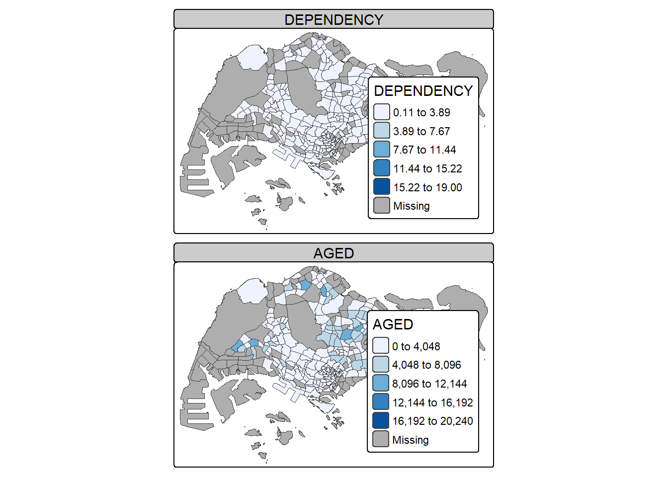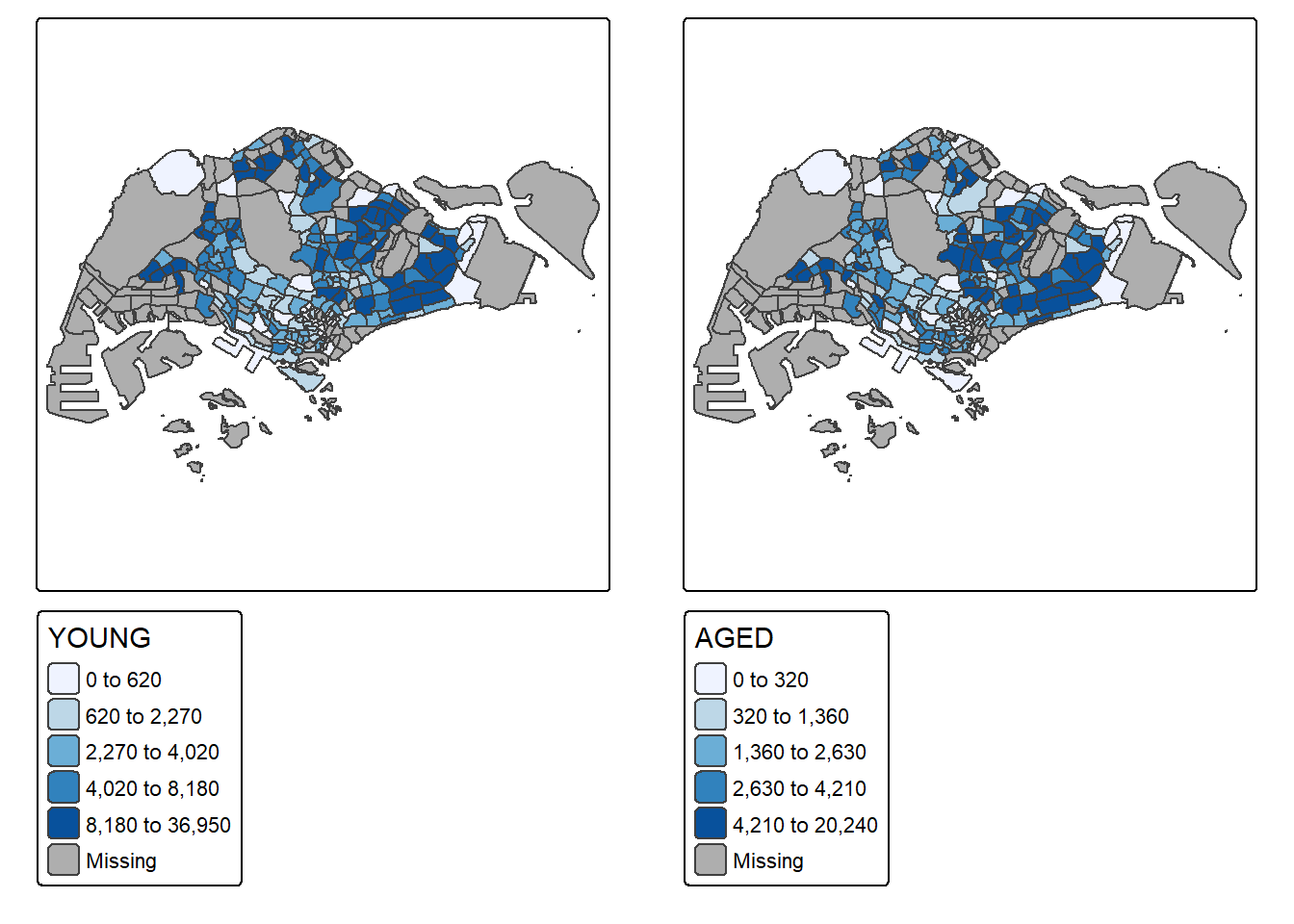 Choropleth mapping involves the symbolisation of enumeration units, such as countries, provinces, states, counties or census units, using area patterns or graduated colors. For example, a social scientist may need to use a choropleth map to portray the spatial distribution of aged population of Singapore by Master Plan 2014 Subzone Boundary.