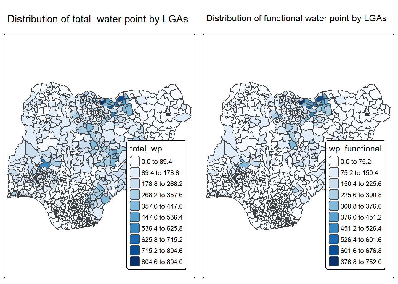 tm_title("Distribution of functional water point by LGAs")In much of our readings we have now seen the importance to map rates rather than counts of things, and that is for the simple reason that water points are not equally distributed in space. That means that if we do not account for how many water points are somewhere, we end up mapping total water point size rather than our topic of interest.