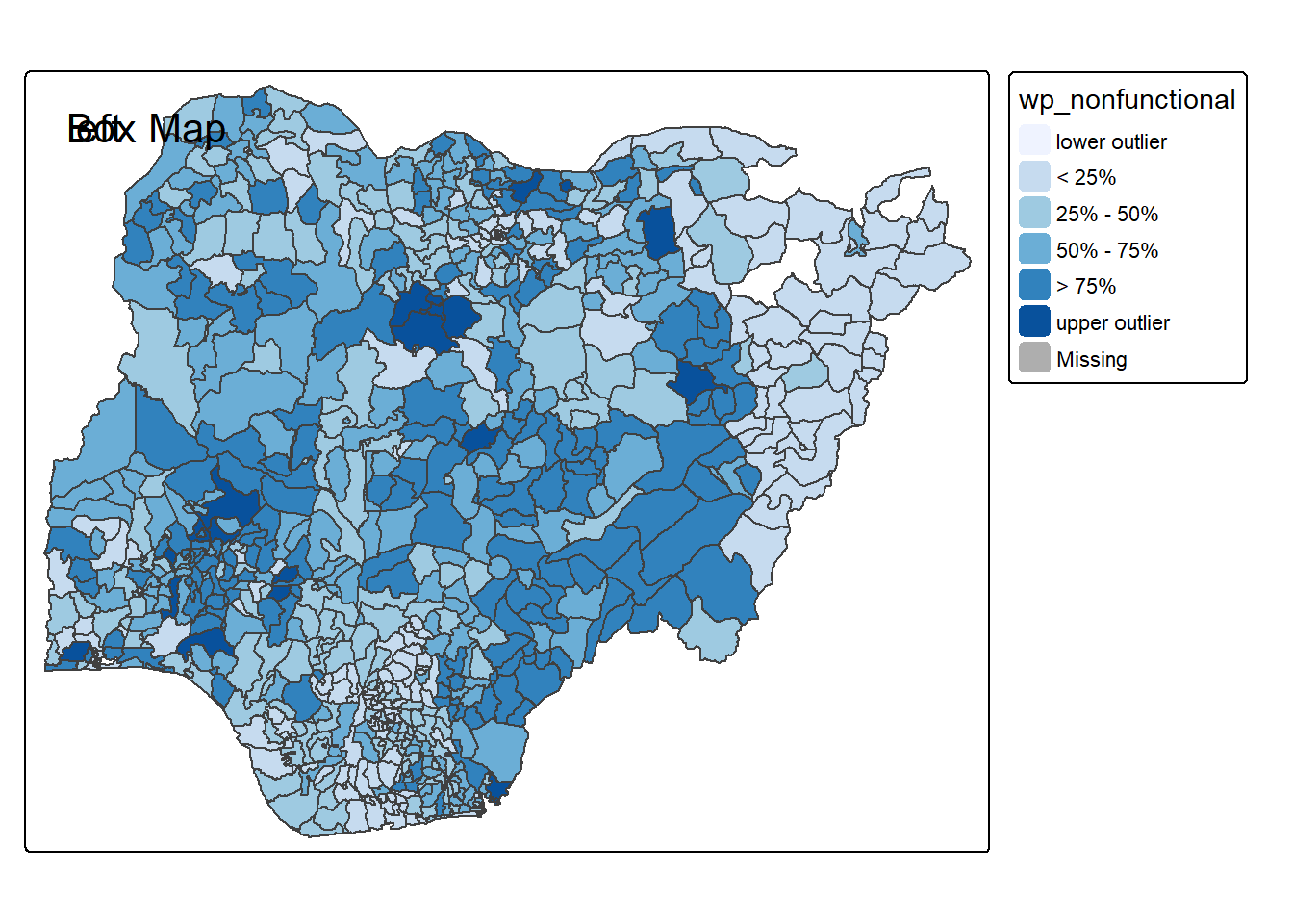 In essence, a box map is an augmented quartile map, with an additional lower and upper category. When there are lower outliers, then the starting point for the breaks is the minimum value, and the second break is the lower fence. In contrast, when there are no lower outliers, then the starting point for the breaks will be the lower fence, and the second break is the minimum value (there will be no observations that fall in the interval between the lower fence and the minimum value).
