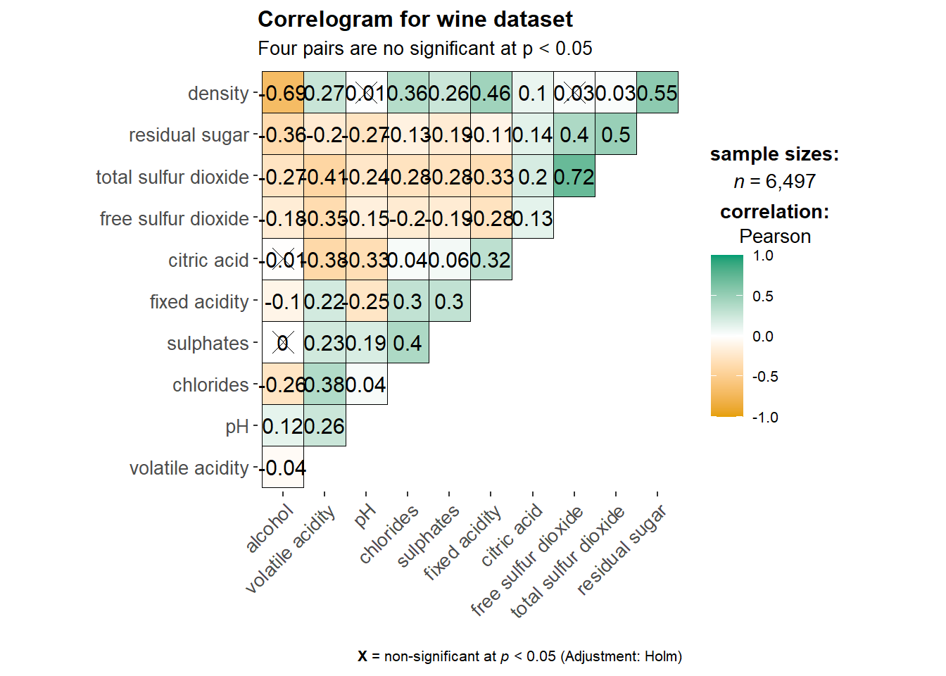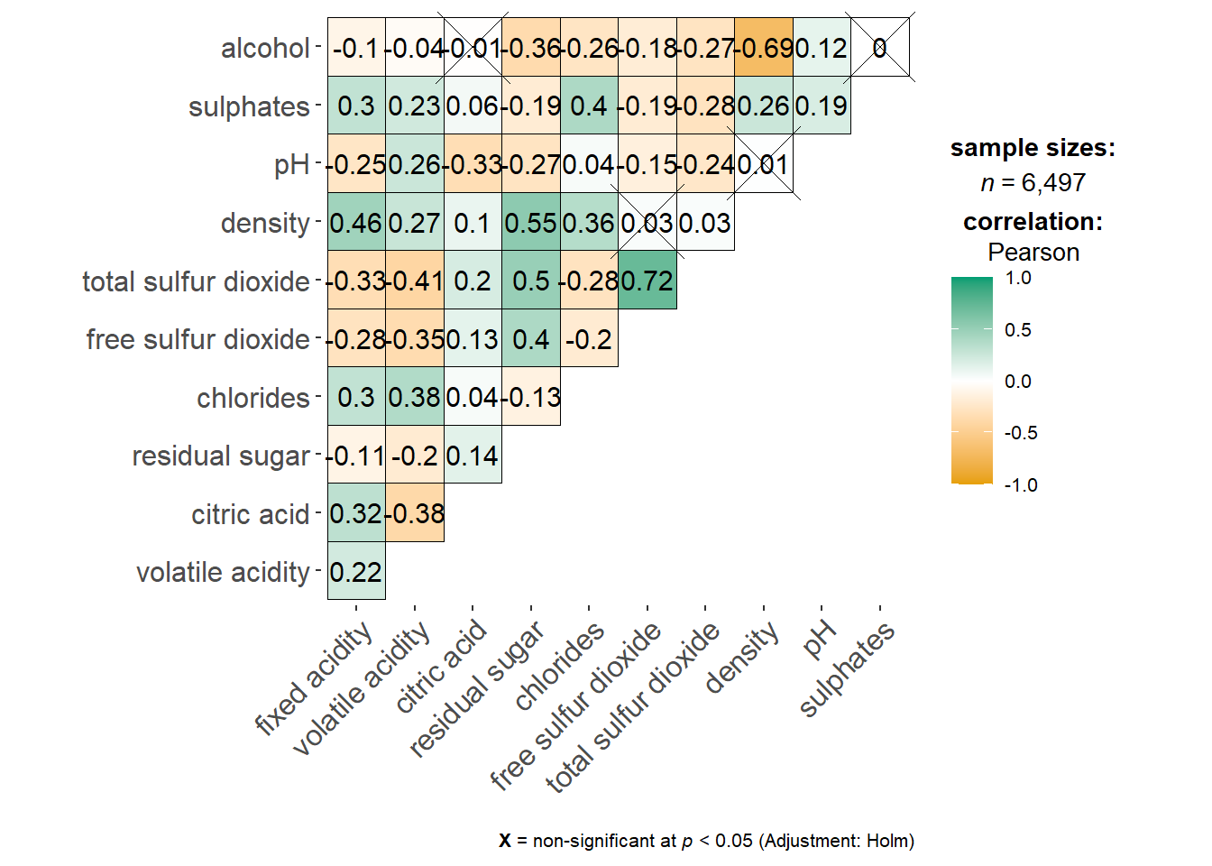 On of the advantage of using ggcorrmat() over many other methods to visualise a correlation matrix is it’s ability to provide a comprehensive and yet professional statistical report as shown in the figure below.