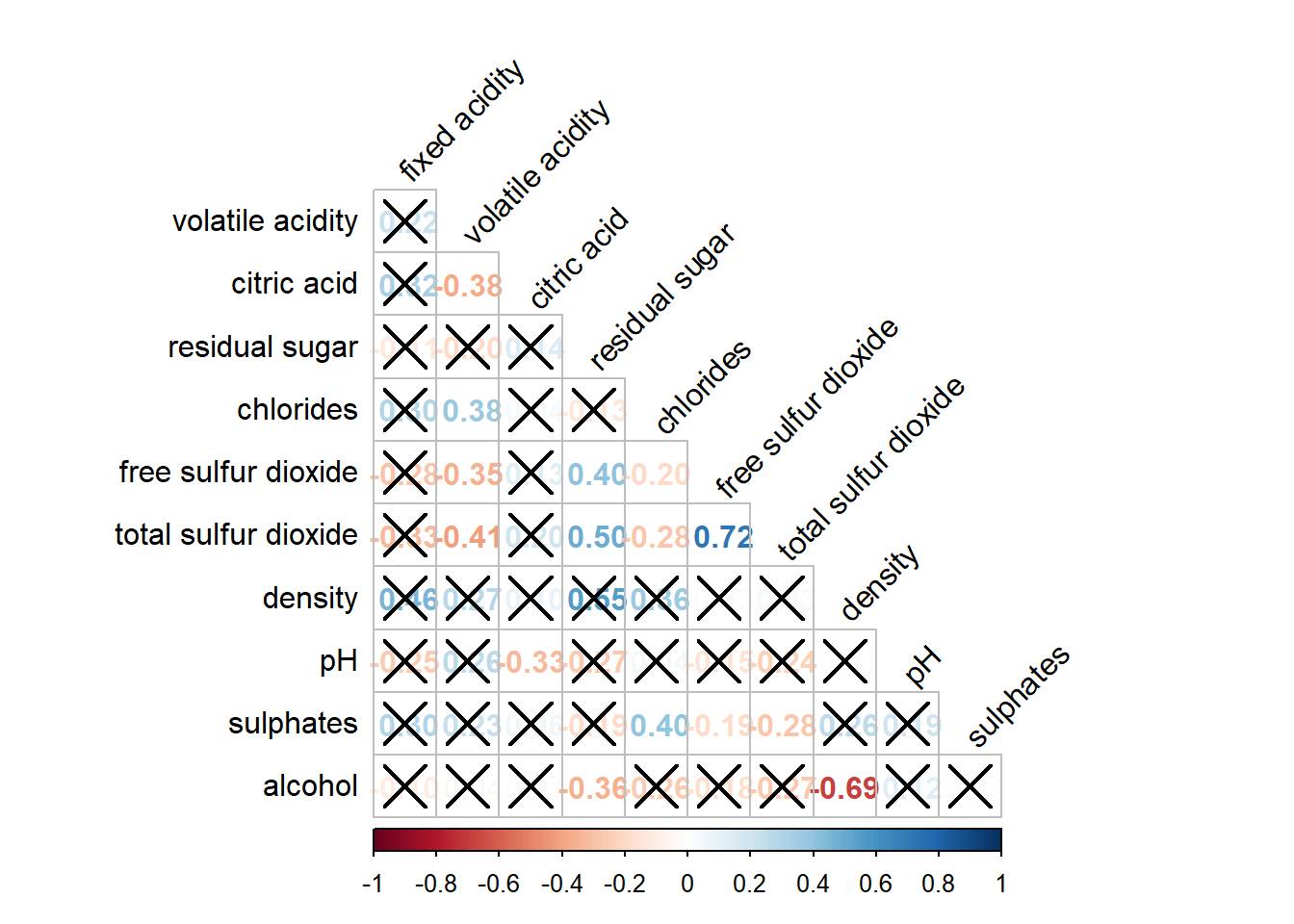 Figure below shows a mixed layout corrgram plotted using wine quality data.