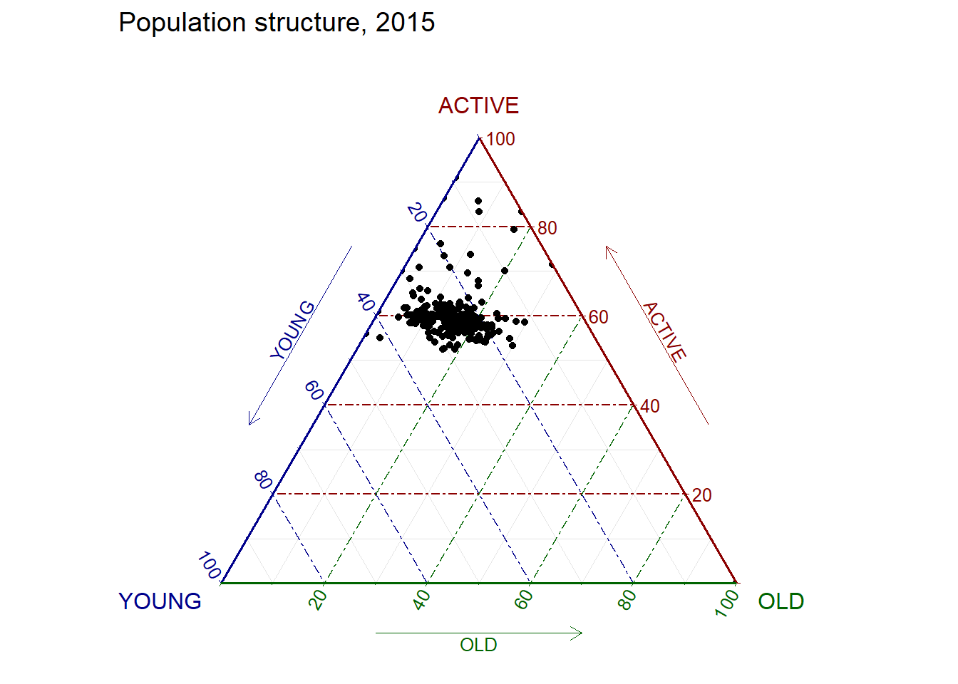 Ternary plots are a way of displaying the distribution and variability of three-part compositional data. (For example, the proportion of aged, economy active and young population or sand, silt, and clay in soil.) It’s display is a triangle with sides scaled from 0 to 1. Each side represents one of the three components. A point is plotted so that a line drawn perpendicular from the point to each leg of the triangle intersect at the component values of the point.