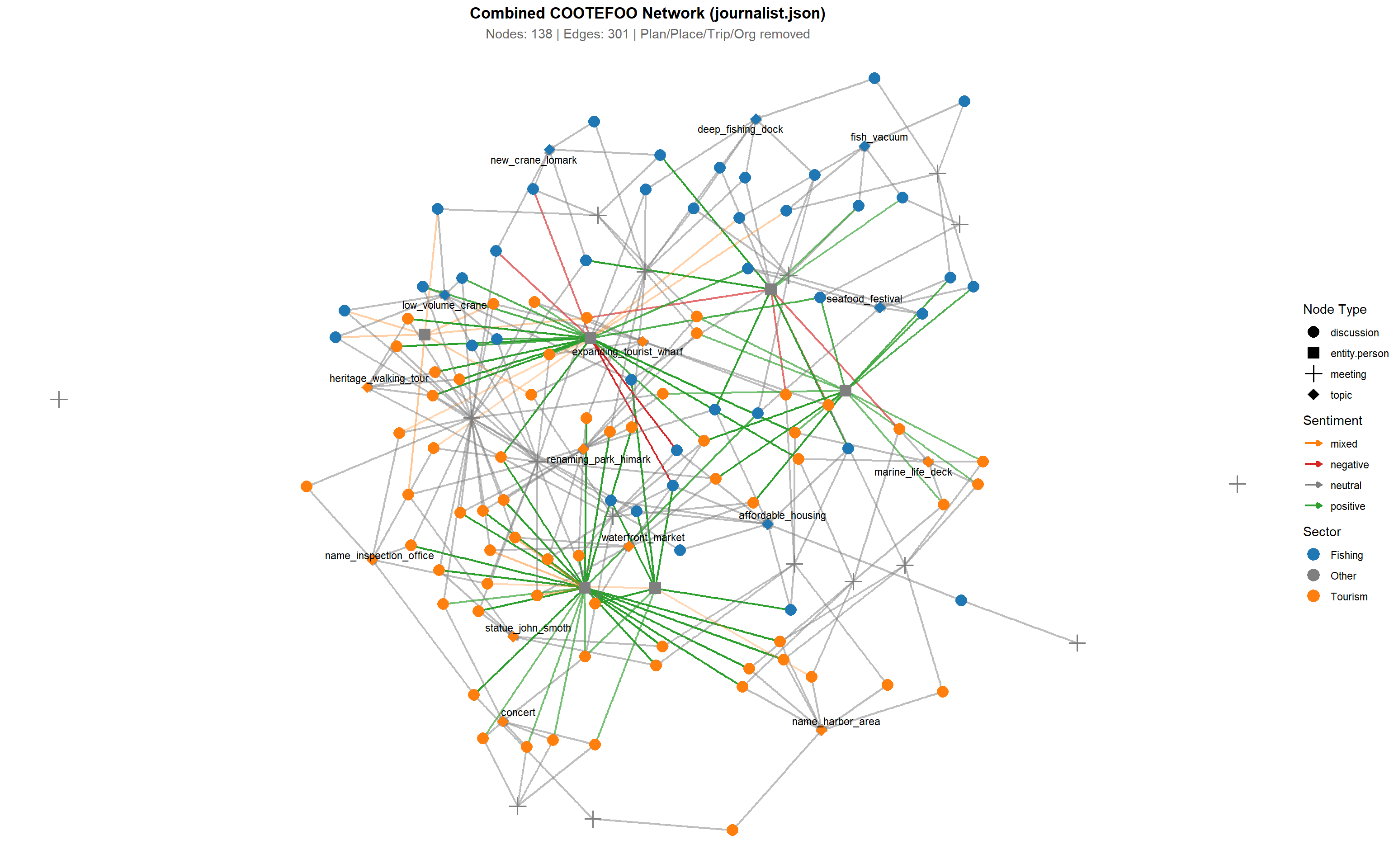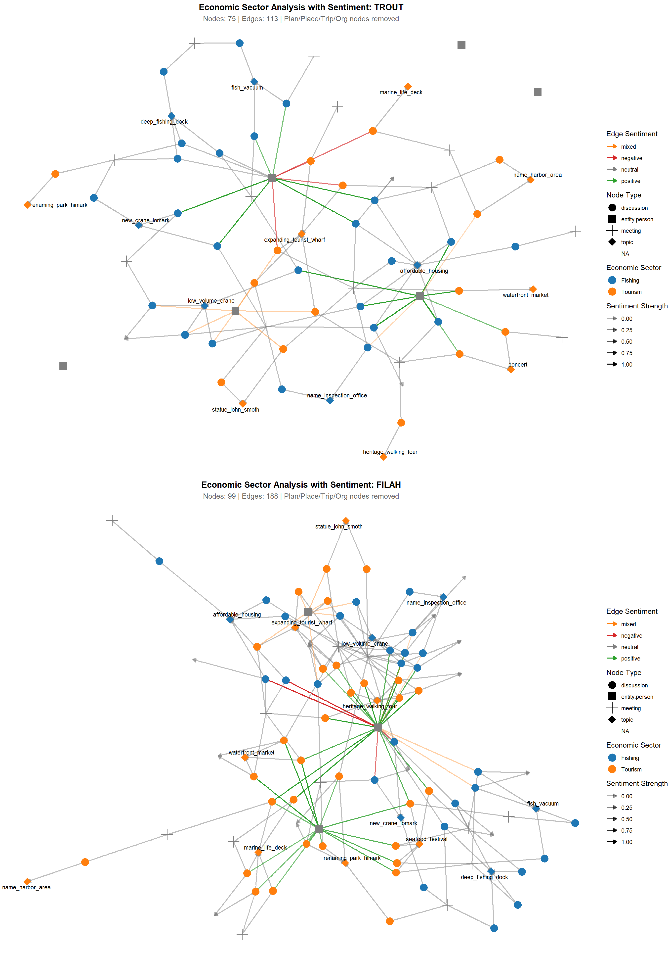 filah_classified <- classify_sectors(filah_graph, "FILAH")We filter out nodes of types plan, place, trip, and entity.organization to focus on the core actors and events. Each node is then classified as Fishin or Tourism based on its label.