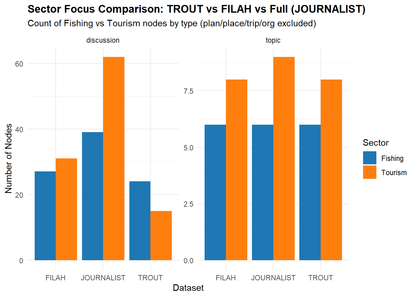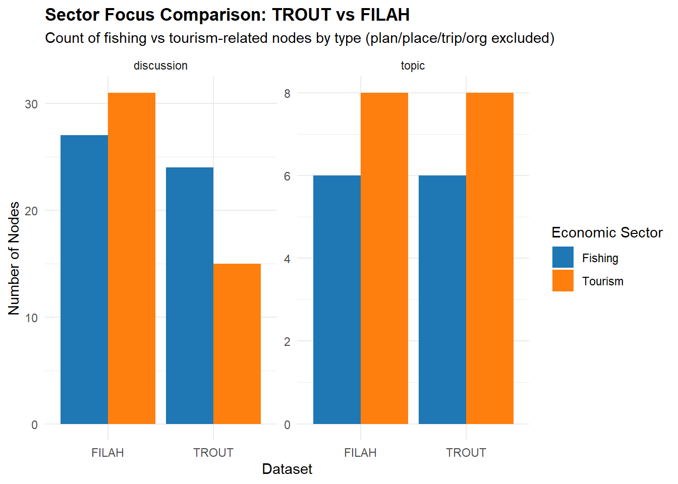 This bar chart summarizes the number of fishing and tourism nodes by type, showing the sectoral focus of each dataset after filtering.