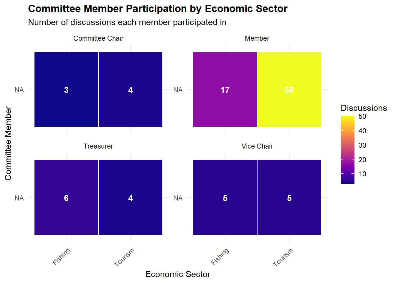 How often each member participates in Fishing vs. Tourism discussions (left);