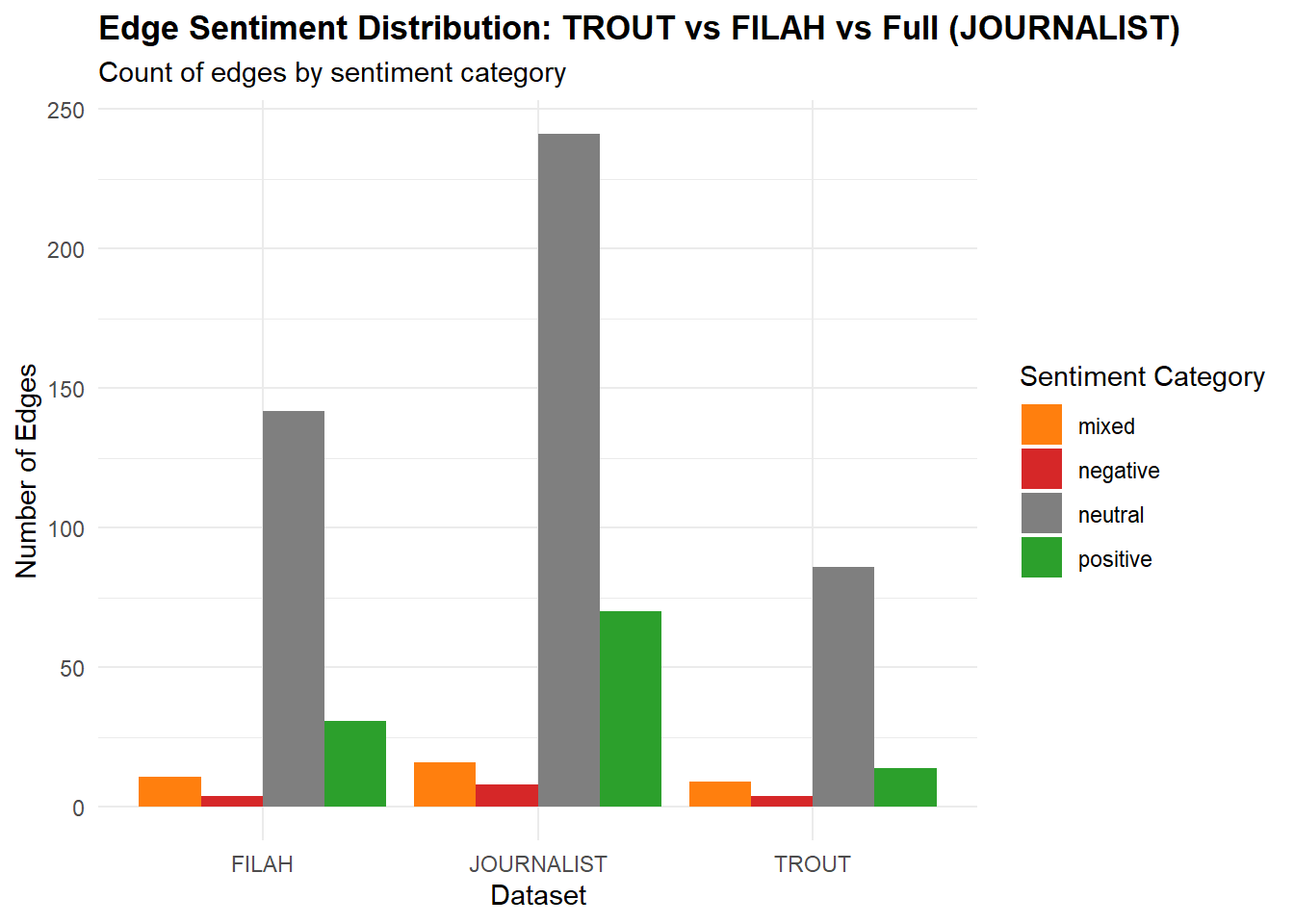 This chart quantifies the edge sentiment distribution in each dataset, revealing the overall tone (positive, negative, neutral, mixed) of interactions and discussions.